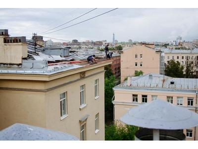 View of two workers on a rooftop in an urban environment. They are engaged in maintenance work, surrounded by roofing materials and tools. The architecture of the surrounding buildings is classic, with a mixture of residential and possibly commercial stru