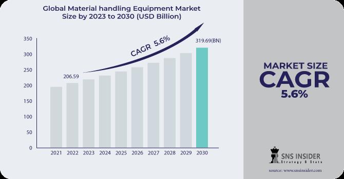 The Material Handling Equipment Market size was estimated at USD 206.59 Billion in 2022 and is expected to reach USD 319.69 Billion by 2030 at a CAGR of 5.6% during the forecast period of 2023-2030.The global material handling equipment market is experiencing substantial growth, fueled by the expansion of manufacturing and logistics industries, the rise of e-commerce, and advancements in automation technology. This press release provides an in-depth analysis of the market, highlighting its scope, key drivers, opportunities, and challenges. It also sheds light on the market dynamics shaping the future of material handling equipment.