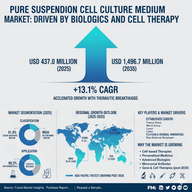 The global pure suspension cell culture medium market is entering a transformative decade, supported by breakthroughs in biotechnology, regenerative medicine, and therapeutic manufacturing. The market, valued at USD 437.0 million in 2025, is projected to expand to USD 1,496.7 million by 2035, advancing at a robust CAGR of 13.1%. This rapid growth is closely tied to the surge in biologics, monoclonal antibodies, gene therapies, and vaccines, which increasingly depend on…