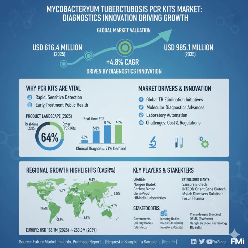 The global fight against tuberculosis (TB) is set to experience a major transformation, as the Mycobacterium tuberculosis PCR detection kits market expands from USD 616.4 million in 2025 to USD 985.1 million by 2035. This trajectory, marked by a compound annual growth rate (CAGR) of 4.8%, reflects how advancements in molecular diagnostics and global health initiatives are shaping the future of TB testing.