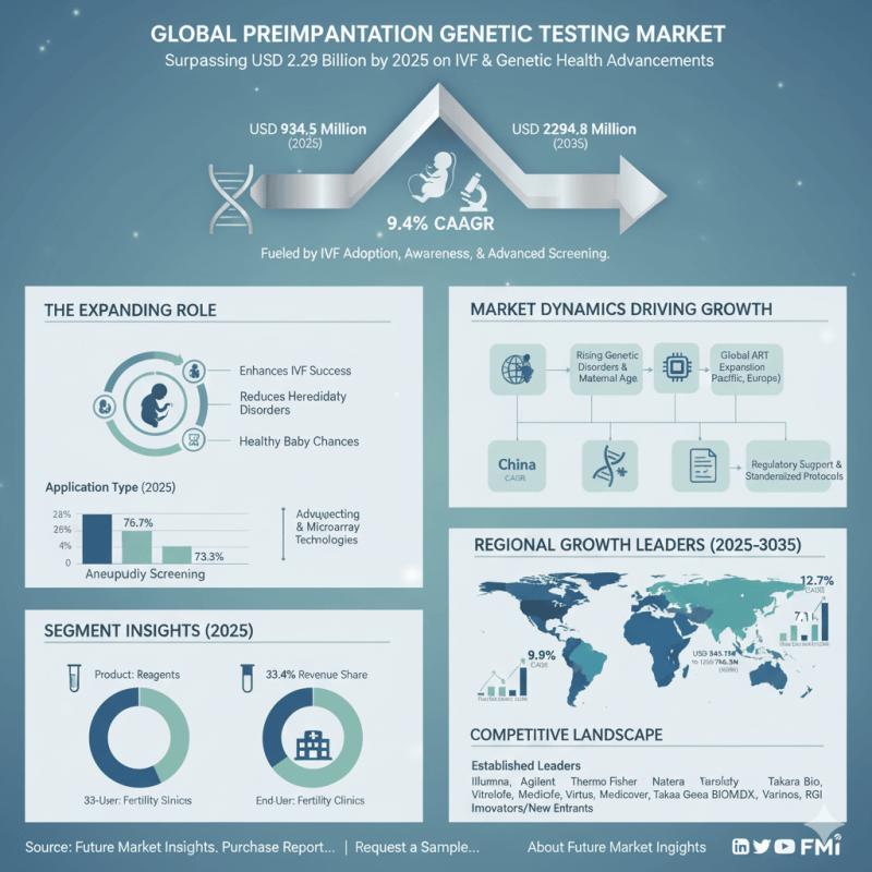 The preimplantation genetic testing (PGT) market is entering a transformative decade. Estimated at USD 934.5 million in 2025, it is projected to climb to USD 2294.8 million by 2035, reflecting a healthy compound annual growth rate (CAGR) of 9.4%. This steady momentum demonstrates how medical innovation, patient awareness, and the rising adoption of assisted reproductive technologies (ART) are converging to redefine reproductive healthcare worldwide.