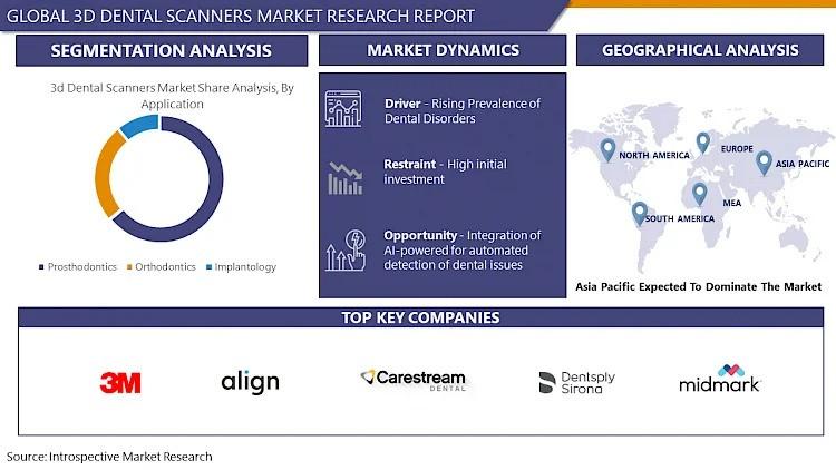 3M Co. (U.S.), Align Technology Inc. (U.S.), Carestream Dental LLC (U.S.), Dentsply Sirona Inc. (U.S.), Midmark Corp. (U.S.), Carestream Health (U.S.), GT Medical (U.S.), Sirona Dental Systems (U.S.), Zimmer Dental (U.S.), Carl Zeiss Opto technik (Germany), AICON 3D Systems (Germany), densys Ltd. (UK), AGE Solutions Srl (Italy), 3Shape AS (Denmark), Amann Girrbach AG (Austria), Planmeca Oy (Finland)