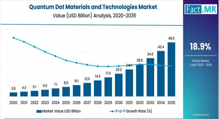 The global quantum dot materials and technologies market is projected to expand from approximately USD 8.5 billion in 2025 to around USD 48.2 billion by 2035, representing a compound annual growth rate (CAGR) of about 18.9% over the forecast period. Growth is underpinned by rising demand for quantum-dot enabled displays, increasing applications in LED lighting, solar cells, and emerging materials, alongside advances in cadmium-free quantum dot technologies and broadening end-use…
