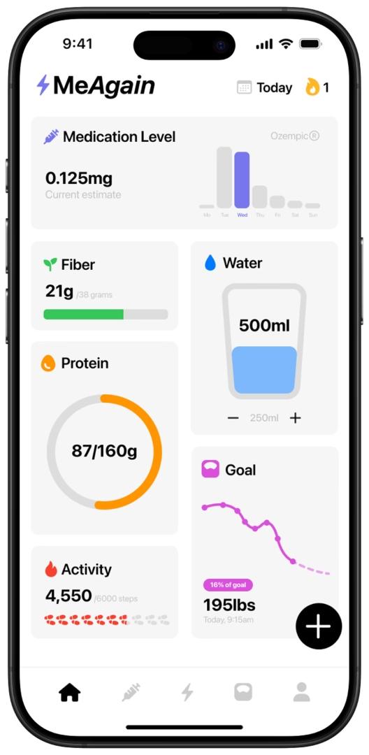 MeAgain, all-in-one platform trusted by thousands delivers Semaglutide-specific tracking combining injection logging, side effect monitoring, protein optimization, and doctor-ready reports in single unified system