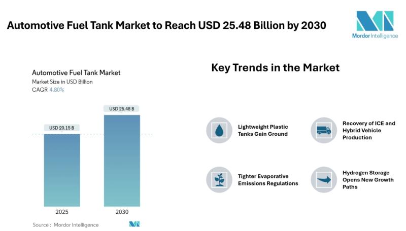 According to a recent report by Mordor Intelligence, The automotive fuel tank market [https://www.mordorintelligence.com/industry-reports/automotive-fuel-tank-market?utm_source=abnewswire] reached USD 20.15 billion in 2025 and is forecast to climb to USD 25.48 billion by 2030, reflecting a 4.80% CAGR. This growth is anchored in a mix of traditional internal-combustion-engine (ICE) demand,…