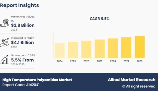 Allied Market Research published a report, titled, "High Temperature Polyamides Market by Type (Polyamide 6, Polyamide 6-6 and Others), Application (Fiber and Films, Engineering Plastics and Others), and End-Use Industry (Automotive, Textile, Consumer Goods, Electrical and Electronics, Construction and Others) : Global Opportunity Analysis and Industry Forecast, 2024-2030". According to the report, the high temperature polyamides market was valued at $2.8 billion in 2023, and is estimated to reach $4.1โฆ