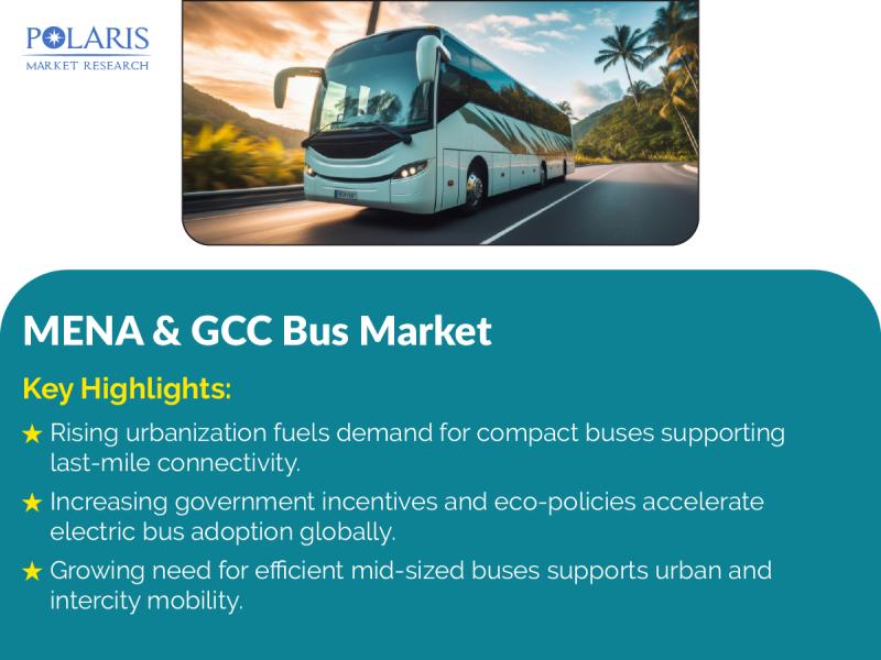 Global MENA & GCC Bus Market is currently valued at USD 1.73 Billion in 2024 and is anticipated to generate an estimated revenue of USD 2.46 Billion by 2034, according to the latest study by Polaris Market Research. Besides, the report notes that the market exhibits a robust 3.6% Compound Annual Growth Rate (CAGR) over the forecasted timeframe, 2025 - 2034