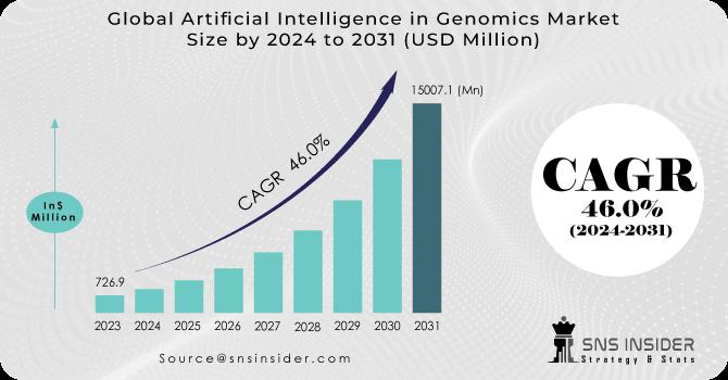 SNS Insider Indicates that the Artificial Intelligence in Genomics market size was valued at USD 726.9 million in 2023 and is expected to skyrocket to USD 15,007.1 million by 2031, exhibiting a staggering compound annual growth rate (CAGR) of 46.0% over the forecast period of 2024-2031. This explosive growth is fueled by the rapid advancements in AI technologies, the exponential growth of genomic data, and the increasing demand for personalized and precision medicine approaches.Report Scope