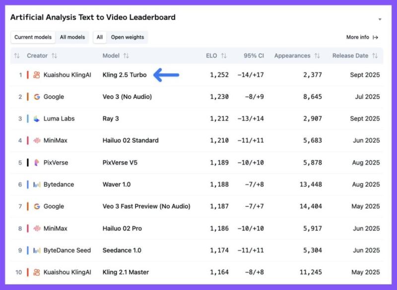 Kling AI's New 2.5 Turbo Hits No.1 in Artificial Analysis Leaderboard