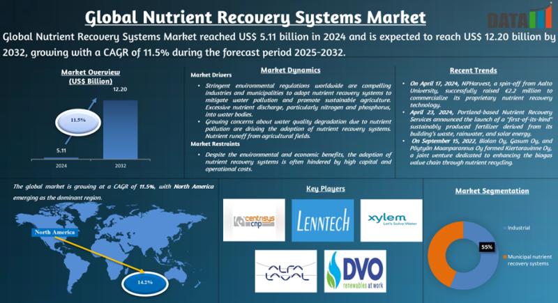 The Global Nutrient Recovery Systems Market size reached US$ 5.11 billion in 2024 and is expected to reach US$ 12.20 billion by 2032, growing with a CAGR of 11.5% during the forecast period 2025-2032.