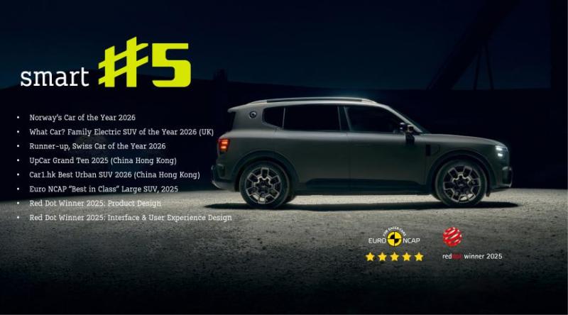 * The all-electric smart #5 has won six major international awards in its global launch year, including Norway's Car of the Year 2026 and Euro NCAP "Best-in-Class" honors.