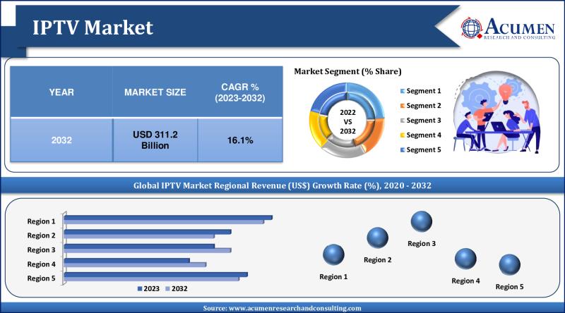 The Internet Protocol Television (IPTV) market is poised for substantial growth in the coming years, underpinned by significant advances in technology and increasing consumer demand for on-demand and personalized viewing experiences. According to recent market analysis, the global IPTV market revenue is projected to reach an impressive USD 311.2 billion by 2032, growing at a compound annual growth rate (CAGR) of 16.1% from 2023 to 2032. This substantial growth is indicative of the shifting paradigms in television consumption and the rapid adoption of IPTV services across various regions.Download Sample Report Copy of This Report from Here: https://www.acumenresearchandconsulting.com/request-sample/408
