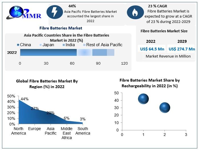 Fibre Batteries Market size was valued at USD 64.5 Mn. in 2022 and the total Fibre Batteries revenue is expected to grow by 23 % from 2022 to 2029, reaching nearly USD 274.7 Mn.
