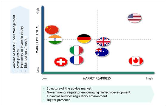 The report shows that the current market for robo advice is dominated by the USA, with an estimated $1.2 trillion under management. The USA's favourable regulatory environment, high propensity to save in equities and the size of its retirement savings market all mean that the USA is the most promising market for robo advice. India and China present long term opportunities but continue to be tied to traditional property, gold and money market fund investments. In Europe the UK looks set for growth, with major pension funds available for investment and a positive environment for fintech.