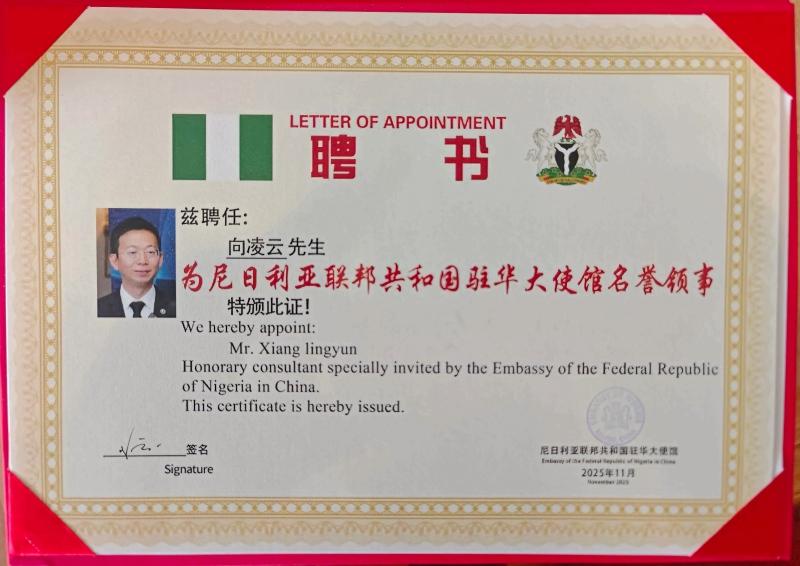 The Embassy of the Federal Republic of Nigeria in China officially announced today the appointment of Prof. Lingyun Xiang, a world-renowned U.S.-based economist, multi-national Academician, and leading expert in emerging industry finance, as the Honorary Consul for the Embassy.
