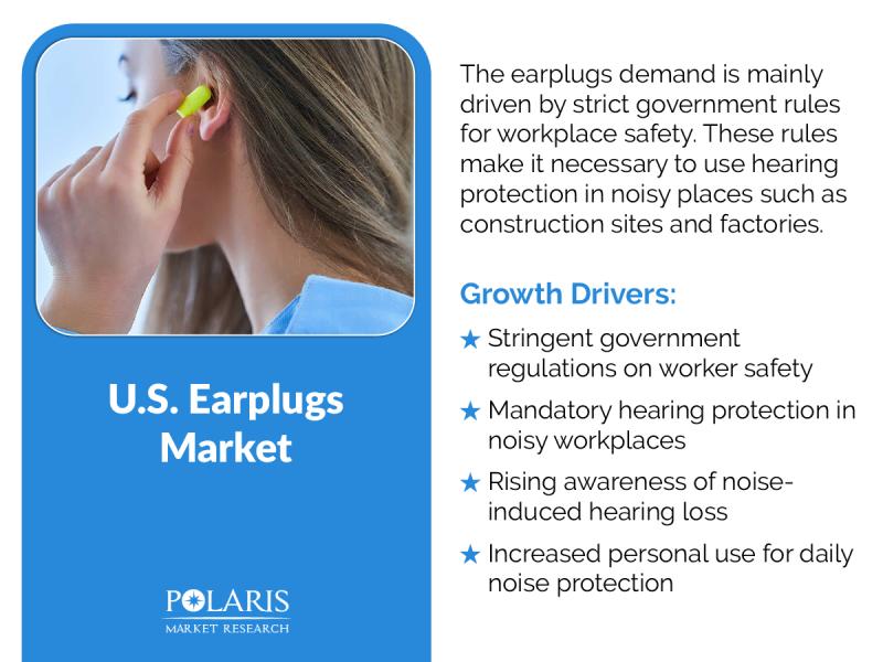 Polaris Market Research recently introduced the latest update on U.S. Earplugs Market that provides an extensive outlook of the market, analyzing key growth opportunities, challenges, risk factors, and emerging trends across diverse geographic regions. The report offers a definitive and meticulous analysis of the U.S. Earplugs market size, share, demand, key growth factors, segmentation, country-level overview, and forecast.