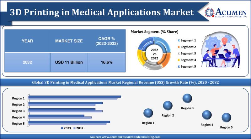 The global 3D printing in medical applications market is undergoing rapid growth and transformation, driven by technological advancements and increasing demand for customized medical solutions. According to recent market research, this sector is expected to see significant expansion, with revenue projected to increase by USD 11 billion by 2032, exhibiting a robust compound annual growth rate (CAGR) of 16.6% from 2023 to 2032. This article explores the key highlights and trends driving this dynamic market, focusing on regional contributions, industry segments, technological advancements, and future prospects.Download Sample Report Copy of This Report from Here: https://www.acumenresearchandconsulting.com/request-sample/154