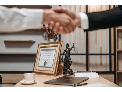 A close-up of two people shaking hands over a desk in a law firm office, with a framed certificate, a statue of Lady Justice, a laptop, and a coffee cup in the background, symbolizing successful legal consultation and agreement.