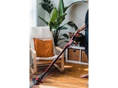 A person vacuuming a living room floor with a modern vacuum cleaner, near a cozy armchair with an orange pillow and surrounded by indoor plants, highlighting routine home cleaning practices.