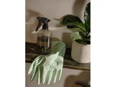 A pair of light green cleaning gloves and a spray bottle placed on a shelf next to a potted plant, highlighting essential cleaning supplies and a touch of greenery for a clean and fresh environment.