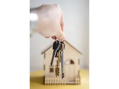 A hand holding a set of house keys in front of a small wooden model of a house, symbolizing the process of buying a new home.