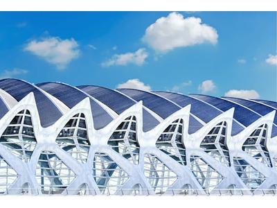 A modern, wavy roofing structure with white, skeletal supports and translucent panels, set against a bright blue sky with scattered clouds, exemplifying innovative and contemporary roofing design.