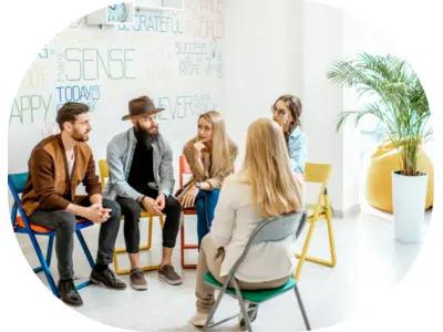 A group therapy session at a rehab center, with five individuals sitting on colorful chairs in a bright, welcoming room decorated with positive words and plants, emphasizing a supportive and encouraging environment for recovery.