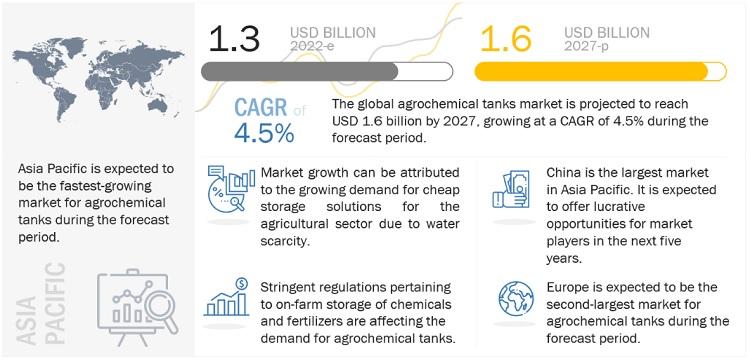 The global Agrochemical Tanks market [https://www.marketsandmarkets.com/Market-Reports/agrochemical-tank-market-3784792.html] is expected to grow from an estimated in USD 1.3 billion in 2022 to USD 1.6 billion by 2027, at a CAGR of 4.5%. The market for Agrochemical tanks market is divided into three categories: Application, region, and By type and By size. The increasing demand for food security and the expanding usage of agrochemicals in agriculture, as well as the growing need for efficient and secure storage solutions, are driving the agrochemical tank market. Opportunities in the market include advancements in storage and handling technologies, the expansion of agriculture in developing nations, rising demand for organic farming practices, and an increase in governmental and private agricultural investments. Furthermore, the growing concern for the environment and the necessity for sustainable agricultural techniques are projected to drive market expansion.
