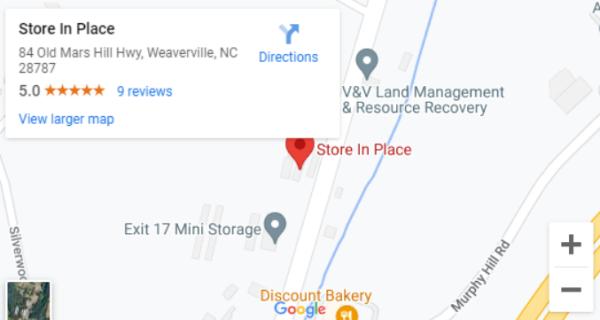 Directions to Store In Place Our Self Storage FacilityStore In Place offers a simple and hassle-free self storage experience for all of our customers in Weaverville, NC, a short 10 minute drive from Asheville, NC. We make sure our storage units are clean, secure, and ready to rent. We also focus on offering a wide variety of storage unit sizes to make sure we can handle any self storage need that you may have. Store In Place also offers online rentals and online bill pay 24/7 to make your experience quick and easy. Feel free to look at our available storage units and give us a call if you have any questions or simply rent your unit right on the website.