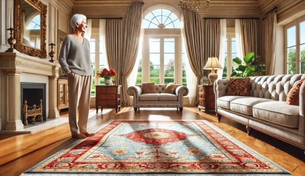 A delighted homeowner admires her beautifully cleaned Oriental rug, expertly restored by Honor Plus Carpet Cleaning's unbeatable service.