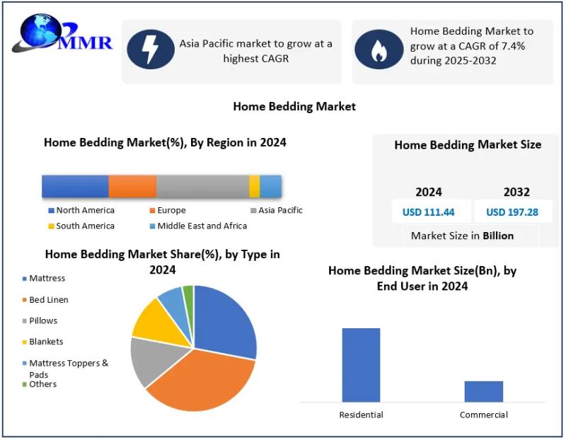 The Home Bedding Market is experiencing robust growth as consumers increasingly prioritize sleep quality, home comfort, and interior aesthetics. According to the latest market analysis, the home bedding market size was valued at USD 111.44 billion in 2024 and is projected to reach USD 197.28 billion by 2032, growing at a compound annual growth rate (CAGR) of 7.4% during the forecast period from 2025 to 2032.