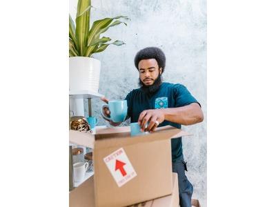 A man with an afro hairstyle is packing a blue cup into a cardboard box labeled 'Caution: Fragile.' He is standing next to a shelf with various household items, including a potted plant and decorative pieces.
