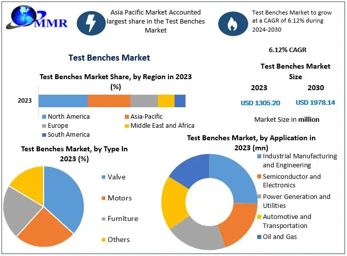Anticipated Growth in Revenue:Test Benches Market size was valued at US$ 1305.20 Mn in 2023 and is expected to reach US$ 1978.14 Mn by 2030 at a CAGR of 6.12% during the forecast period.