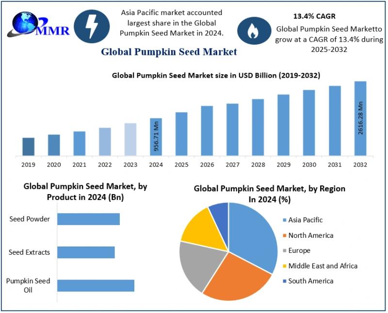 The global Pumpkin Seed Market was valued at USD 956.71 million in 2024 and is projected to reach approximately USD 2616.28 million by 2032, reflecting a compound annual growth rate (CAGR) of 13.4% from 2025 to 2032.