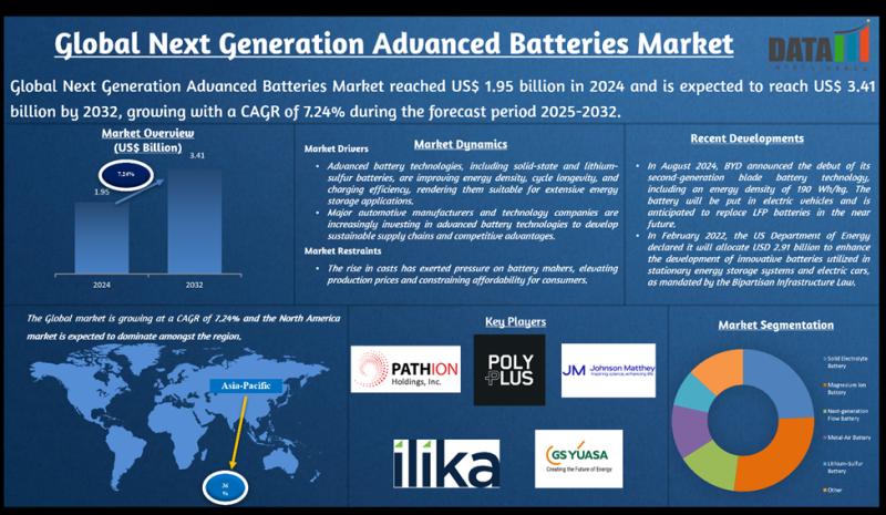 The Global Next Generation Advanced Batteries Market size reached US$ 1.95 billion in 2024 and is expected to reach US$ 3.41 billion by 2032, growing with a CAGR of 7.24% during the forecast period 2025-2032