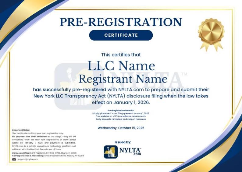 NEW YORK, NY - November 6, 2025 - NYLTA.com today announced the launch of a statewide pre-registration initiative to assist limited liability companies (LLCs) in preparing for the New York LLC Transparency Act (NYLTA), which takes effect on January 1, 2026. The new law will require all LLCs formed or operating in New York to disclose their beneficial ownership information to state authorities.