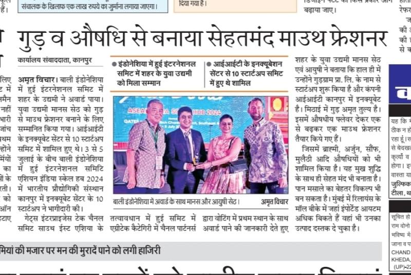 The city's entrepreneur received the award in the International Committee held in Indonesia with Amrit Vichar. Young entrepreneur Manas Seth was honored for making a good mouth Freshner. 10 Startups from IIT's startups from these B.Ed Center participated in the international Committee Asia India Scale Hub 2024 held in Indonesia between 3rd to 5th july. Giving information about getting the award with first place in voting by channel partners in Agri Tech category in the committee held under the influence of Gate Enterprises Tech Channel Committee South East in Asia, young entrepreneurs of the city Manav Seth and Ayushi said that recently they Has started a startup in the name of Gudhgrams Private Limited and the company is an incubator in IIT Kanpur. Jaggery in sweets is like nectar. Many mouth fresheners have been prepared by giving medicinal flavor in it, in which medicinal herbs like Brahmi, Arjun Shop, Mulethi etc. have also been included. Along with the main purification, it also becomes healthy. It can also become a better alternative to paan masala. In Reliance's Malvi store in Mumbai, where imported items are sold more, their product has already hit the market.