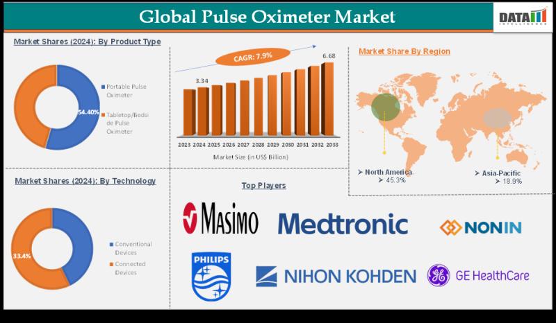 As per DataM Intelligence research report, "The Global Pulse Oximeter Market reached US$ 3.34 billion in 2024 and is expected to reach US$ 6.68 billion by 2033, growing at a CAGR of 7.9% during the forecast period 2025-2033." Increasing demand for continuous patient monitoring and rising prevalence of respiratory conditions are driving market growth.