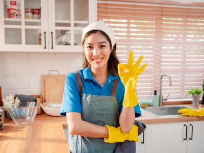 A person wearing a blue polo shirt, an apron, and yellow cleaning gloves smiles and makes an 'OK' hand gesture while standing in a clean, well-lit kitchen.