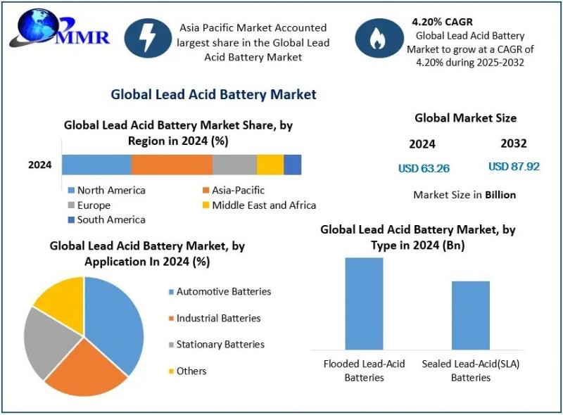 Lead Acid Battery Market was valued at USD 63.26 Bn in 2024 and is expected to reach USD 87.92 Bn by 2032, at a CAGR of 4.20% during the forecast period.