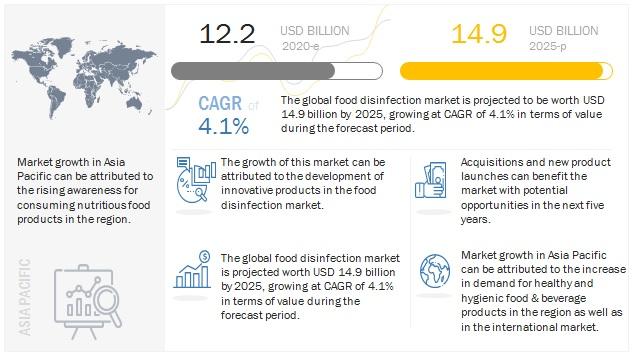 The global food disinfection market is expected to reach a value of USD 14.9 billion by 2025, growing at a CAGR of 4.1% during the forecast period. Factors such as the increasing occurrences of foodborne diseases and growing safety concerns related to food are driving the market for food & beverage disinfection, which is achieved by certain chemicals and technology (equipment). Chemical disinfectants are more frequently used in food production facilities than thermal or radiation techniques.Download PDF Brochure: https://www.marketsandmarkets.com/pdfdownloadNew.asp?id=101417056