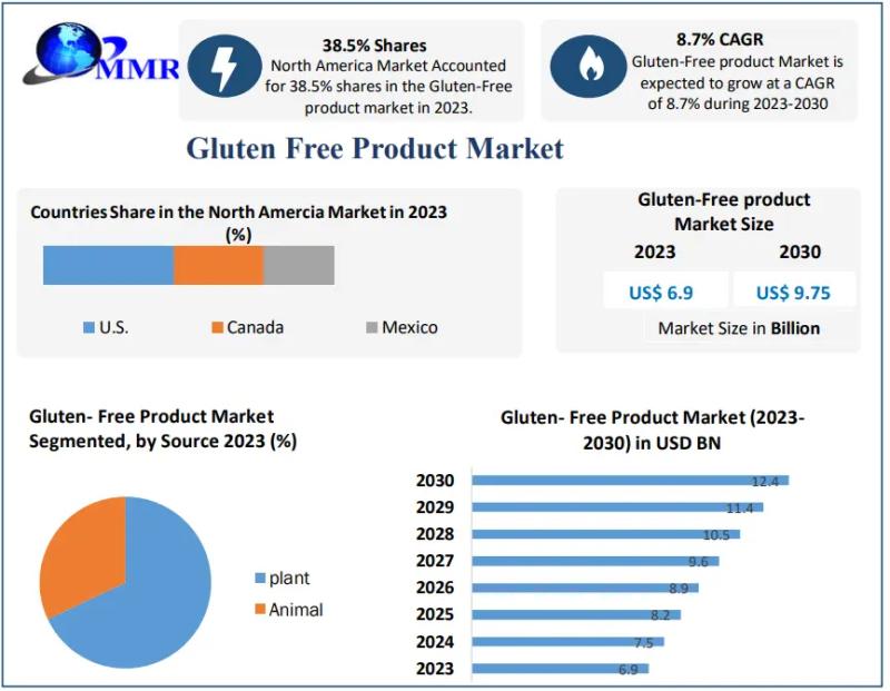 Anticipated Growth in Revenue:Gluten Free Product Market size was valued at USD 6.9 Billion in 2023 and Gluten Free Product market grow by 8.7% from 2024 to 2030, reaching nearly USD 9.75 Billion.
