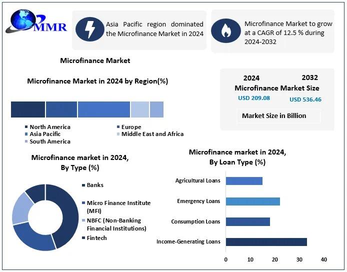 Microfinance Market size was valued at USD 209.08 Billion in 2024 and the total Microfinance Market revenue is expected to grow at a CAGR of 12.5 % from 2024 to 2032, reaching nearly USD 536.46 Billion.