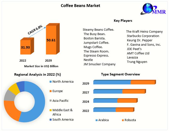 Anticipated Growth in Revenue:Coffee Beans Market was valued at USD 31.93 Billion in 2022, and it is expected to reach USD 50.61 Billion by 2029, exhibiting a CAGR of 6.8 % during the forecast period (2023-2029)
