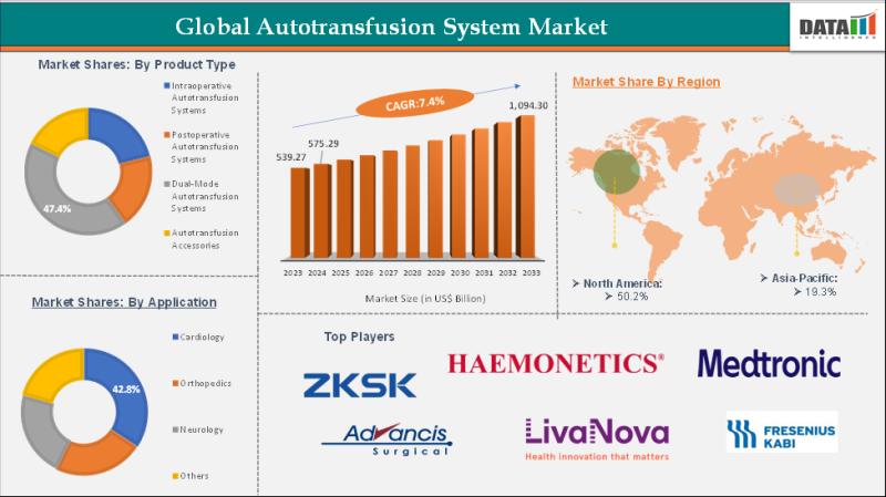 In 2023, the global autotransfusion system market was valued at US$ 539.27 million, increasing to US$ 575.29 million in 2024 and projected to reach US$ 1,094.30 million by 2033, growing at a CAGR of 7.4% during the forecast period from 2025 to 2033. Autotransfusion systems are medical devices that collect, filter, and reinfuse a patient's own blood during surgical procedures, reducing the need for allogeneic blood transfusions and minimizing…
