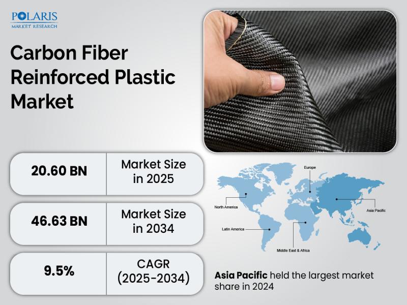 Carbon Fiber Reinforced Plastic Market is currently valued at USD 18.86 billion in 2024 and is anticipated to generate an estimated revenue of USD 46.63 billion by 2034, according to the latest study by Polaris Market Research. Besides, the report notes that the market exhibits a robust 9.5% Compound Annual Growth Rate (CAGR) over the forecasted timeframe, 2025 - 2034