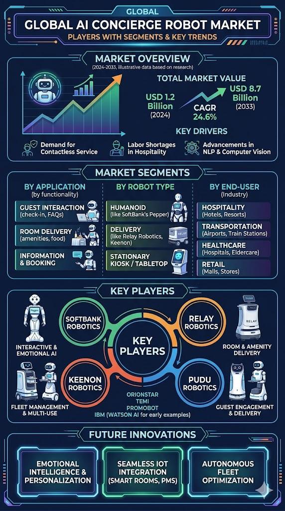 The Global AI Concierge Robot Market is stepping into a new era where service automation meets human-like interaction. No longer limited to basic assistance, these intelligent robots are transforming hospitality, healthcare, retail, and corporate environments by delivering personalized, efficient, and contactless customer experiences. This market reflects the growing demand for smart service ecosystems powered by artificial intelligence, robotics, and real-time data analytics.