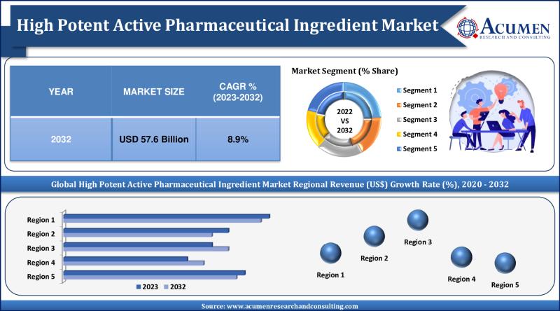 Acumen Research and Consulting, a leading market research and business consulting firm, has released a comprehensive report on the High Potent Active Pharmaceutical Ingredient (HPAPI) Market. The report highlights the significant growth trajectory of the HPAPI market, which accounted for USD 26.8 billion in 2023 and is projected to reach USD 57.6 billion by 2032, growing at a compound annual growth rate (CAGR) of 8.9% from 2024 to 2032.Market Overview