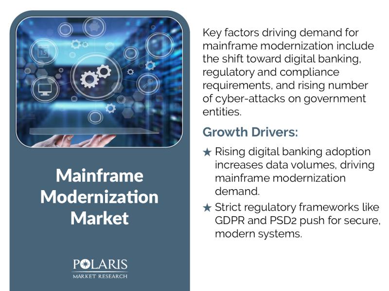 Global Mainframe Modernization Market size and share is currently valued at USD 7.62 Billion in 2024 and is anticipated to generate an estimated USD 18.64 Billion by 2034, according to the latest study by Polaris Market Research. Besides, the report notes that the market exhibits a robust 9.38 % Compound Annual Growth Rate (CAGR) over the forecasted timeframe, 2025 - 2034