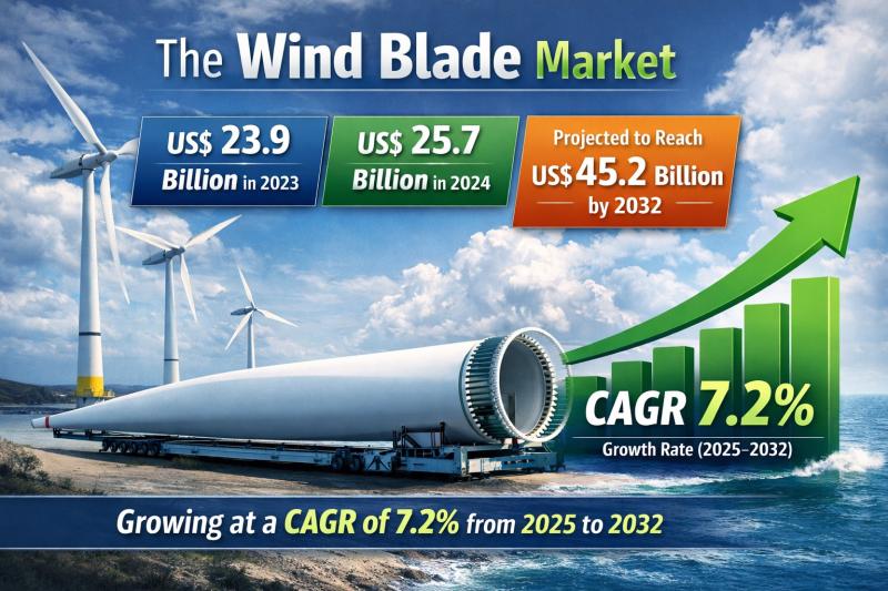 Leander, Texas and Tokyo, Japan - Feb.25.2026 The Wind Blade market reached US$23.9 billion in 2023, rising to US$25.7 billion in 2024 and is expected to reach US$45.2 billion by 2032, growing at a CAGR of 7.2% from 2025 to 2032. The Wind Blade Market is expanding steadily as global renewable energy targets and investments in wind power installations rise. Wind blades are critical components of wind turbines, and demand is driven